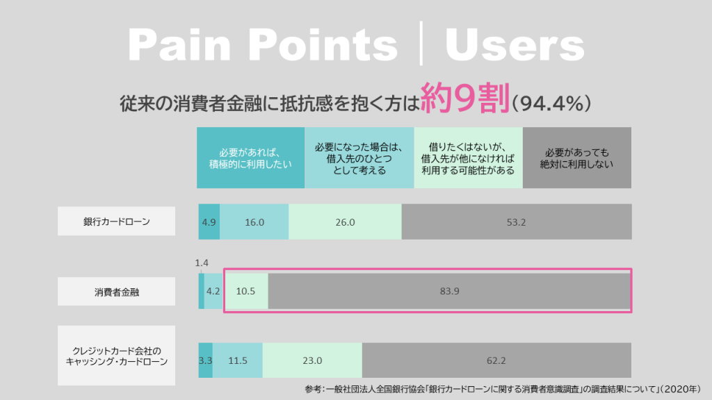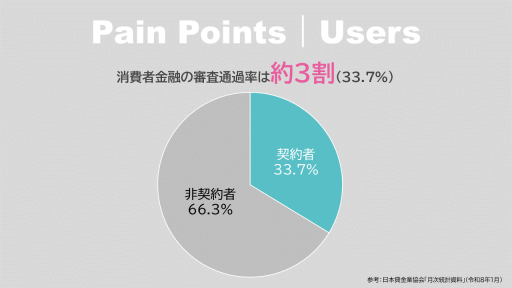 従来の消費者金融の利用に抵抗を感じる人は約9割と心理的なハードルが高く、高いハードルを乗り越えて申込んでも消費者金融の審査通過率はわずか3割と、残り7割の資金ニーズに応えられていない現状があります。これは、金融機関の多くが属性などの表面的なデータのみで与信判断を行わざるを得ないことに起因しています。
