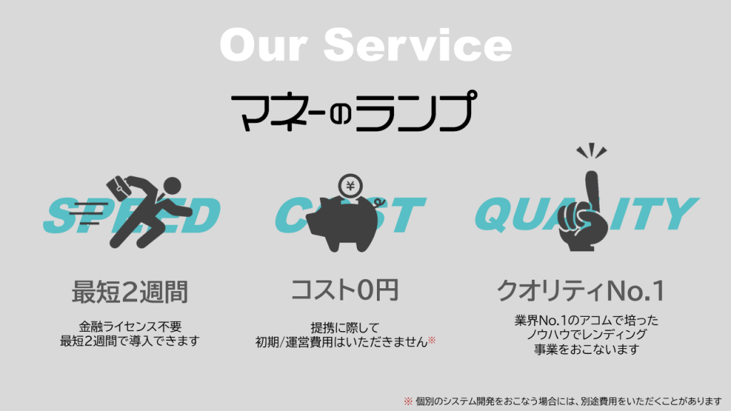 マネーのランプは、業界トップのアコムグループのデータ・ノウハウ・知見を活かし、最短2週間の導入スピード、コスト0円、高いサービス品質を実現したサービスです。