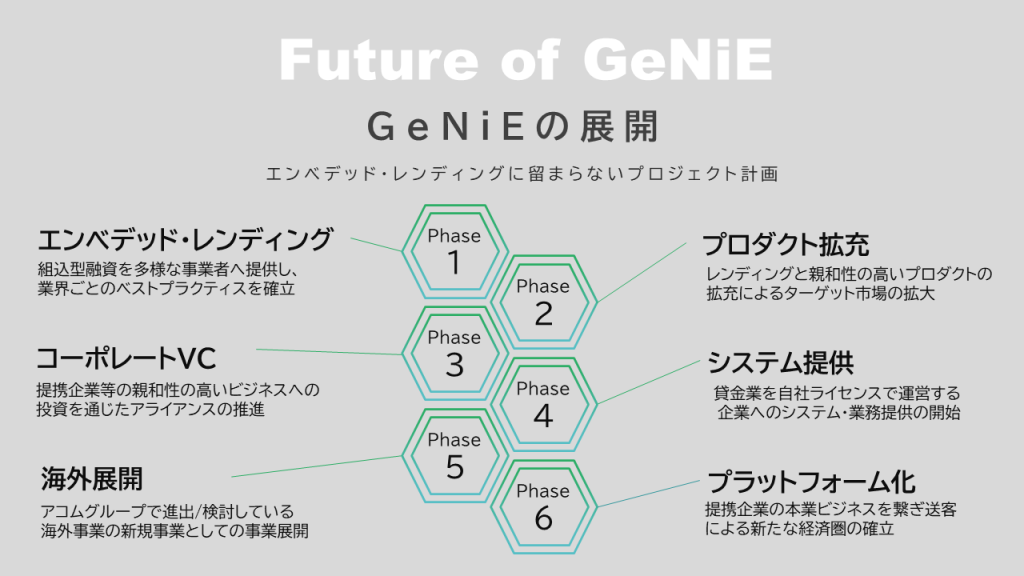GeNiEは、レンディング(貸付)領域におけるエンベデッド・ファイナンスを推進するべく設立された、消費者金融のリーディングカンパニーであるアコム株式会社の子会社です。エンベデッド・ファイナンスとは「事業会社が、自社のサービスに金融サービスを組み込んで提供する」ことを指します。GeNiEは、2024年6月より、Webやアプリを通じてサービスを提供する事業会社が既存事業にレンディング機能をプラスするための組込型金融サービス「マネーのランプ」を提供しています。