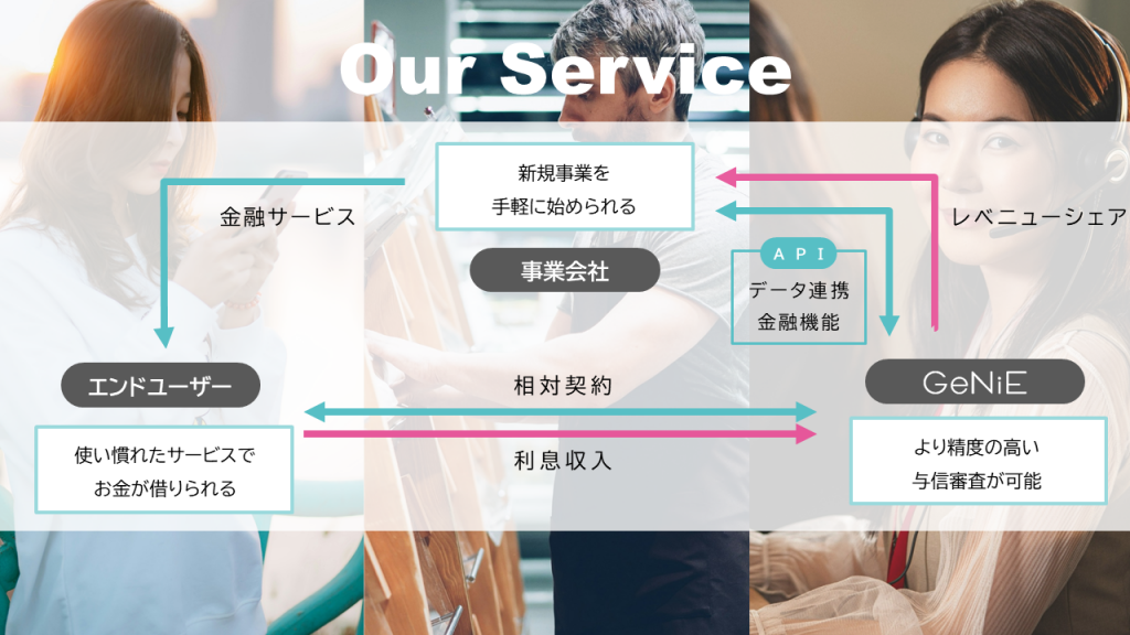また、事業会社にとっては、API接続だけで金融事業に参入することができ、レベニューシェアにより新たな収益源を得ることも可能になります。金融業務は全てGeNiEが担うため、特別なライセンスや金融事業に関する知見は必要ありません。